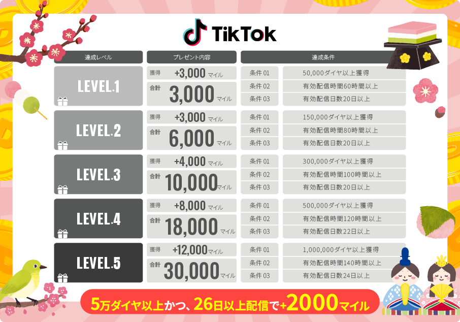 例)TikTok Lv.5達成の場合は30,000マイル